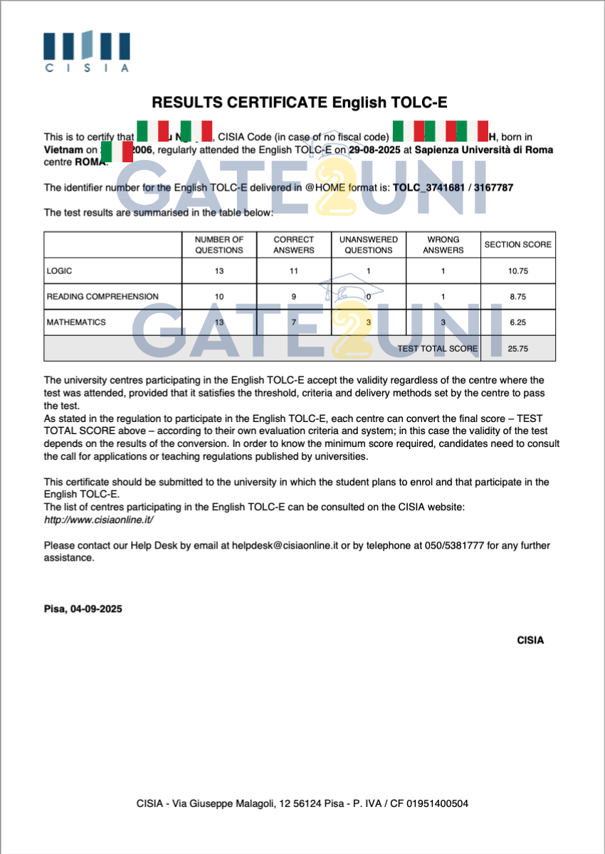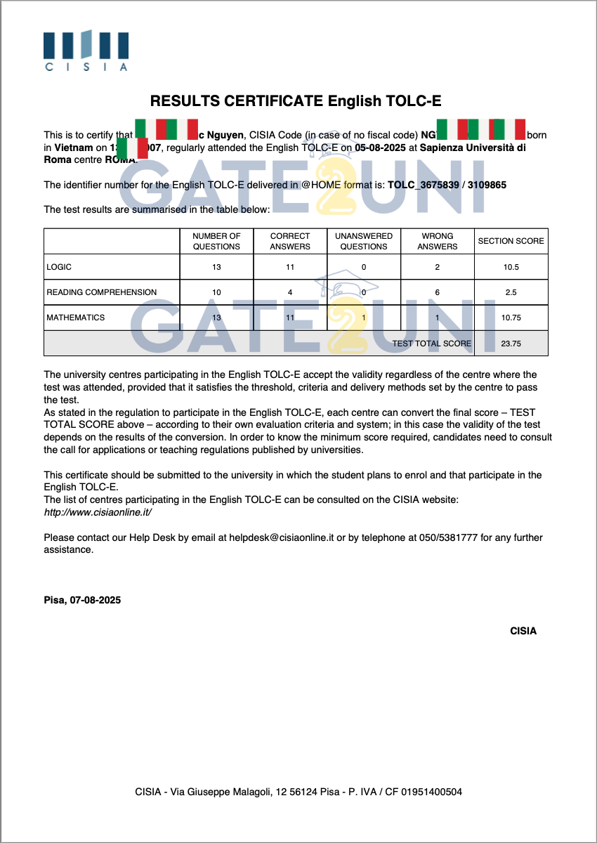 Trong 3 năm qua, nhiều học viên Gate2Uni đã đạt điểm TOLC-E cao, thi đậu University of Torino, Macerata, Brescia, Ca Foscari – những ngôi trường top của Ý.